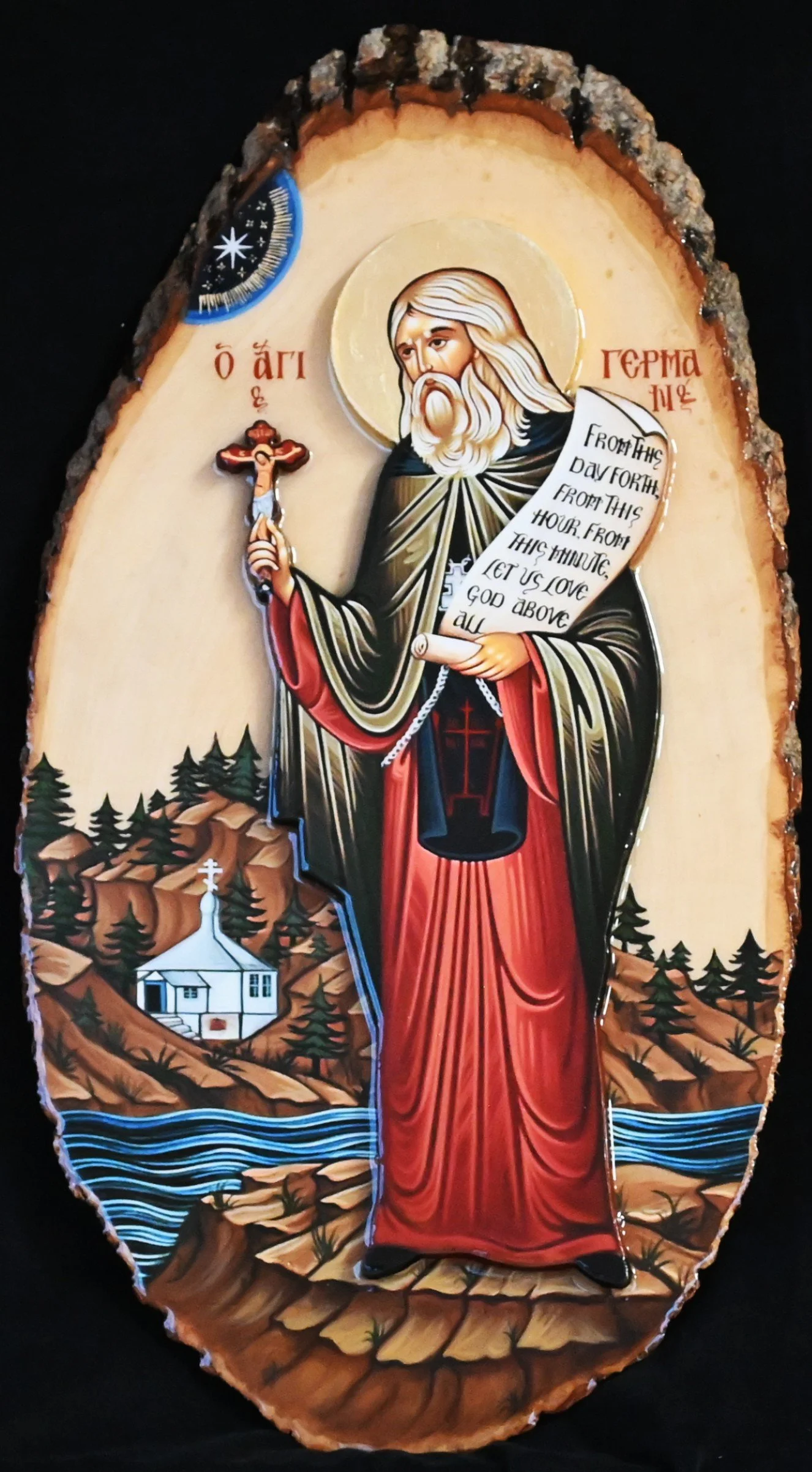 SOLD #WD8 SAINT HERMAN OF ALASKA $275 DESCRIPTION: The icon’s scenic background is mounted on an elongated wood trunk slice (9 ½” x 19”). The figure of the Saint is cutout and mounted onto the board producing a 3-dimensional effect. Details of gold and silver leaf accent the icon. The original was hand-painted by Gerontissa Theophano. BACKGROUND: Click on the icon to read about the Saint.