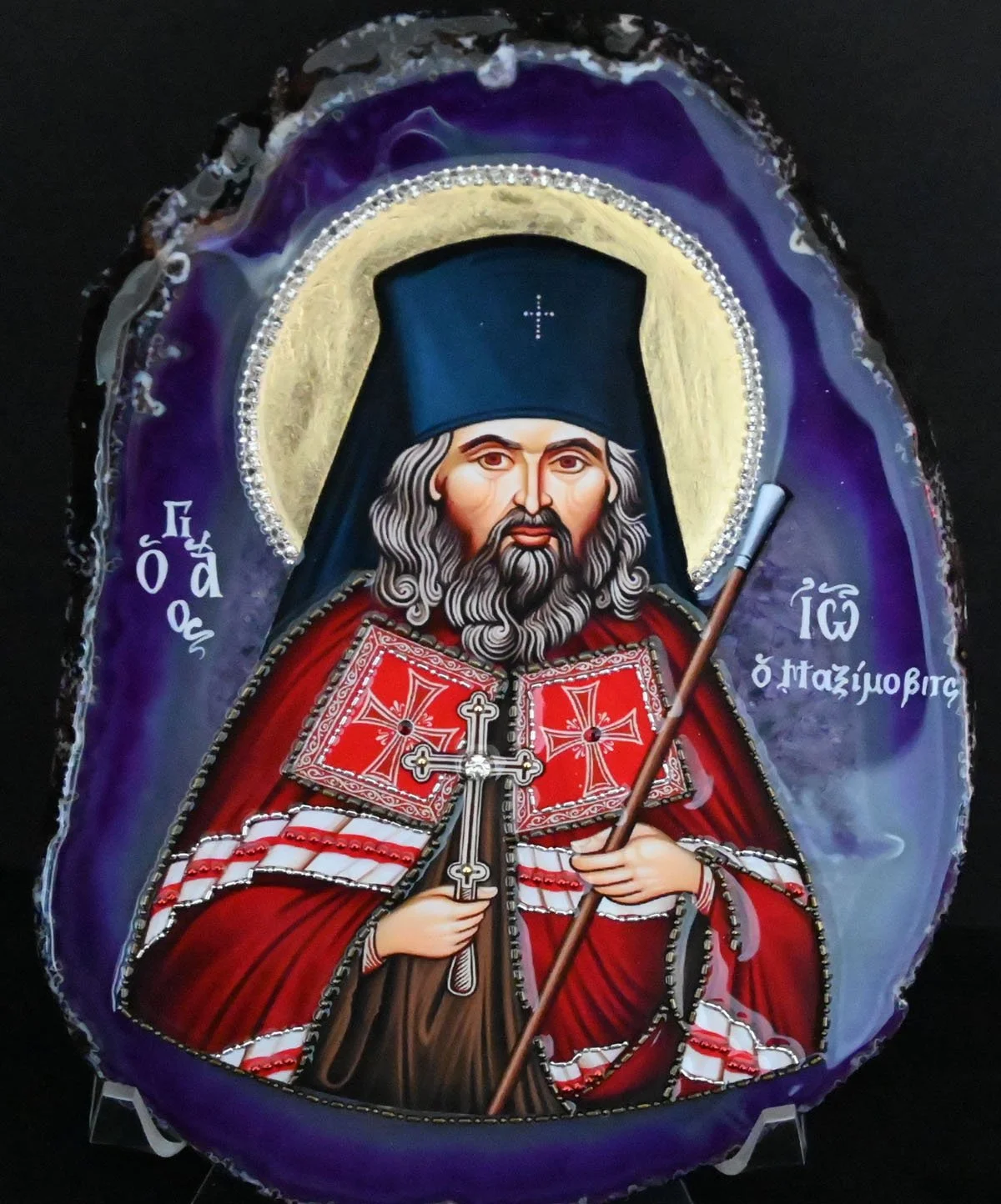 #AG19 SAINT JOHN MAXIMOVITCH $160 DESCRIPTION: The icon is mounted on a purple Brazilian agate slice with light purple and white banding (8 x 6 x ¼) 0.8 lbs. The photostephano (halo) is hand-glided gold, encircled with silver and crystal, metal strands. The garments are accented with antique brass, gold and silver metal strands with pearls and crystals. The original was hand-painted by Gerontissa Theophano. The icon comes with a clear plastic stand. BACKGROUND: Click on the icon to read about the Saint.
