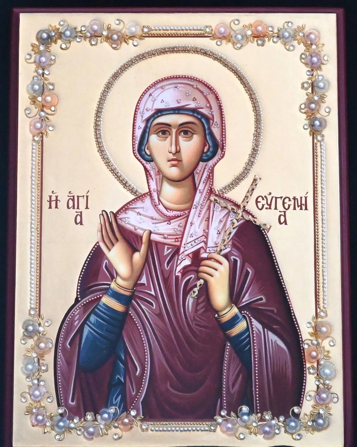 #WD9 SAINT EUGENIA $185 DESCRIPTION: This icon is mounted on a wood board (9” x 12”). The background is gold-gilded with a maroon color bevel. The border framing the Saint is lined with gold and metal strands. The gold floral metal corners are accented with pastel flower, pearls and crystals. The Saint’s phototstephano (halo) is lined with peach crystal and silver strands. The Saint’s garments are lined with colored metal strands and embellished with pearls. The Cross that she is holding is decorated with gold metal filigree pieces. Click on the icon to read more about the Saint.