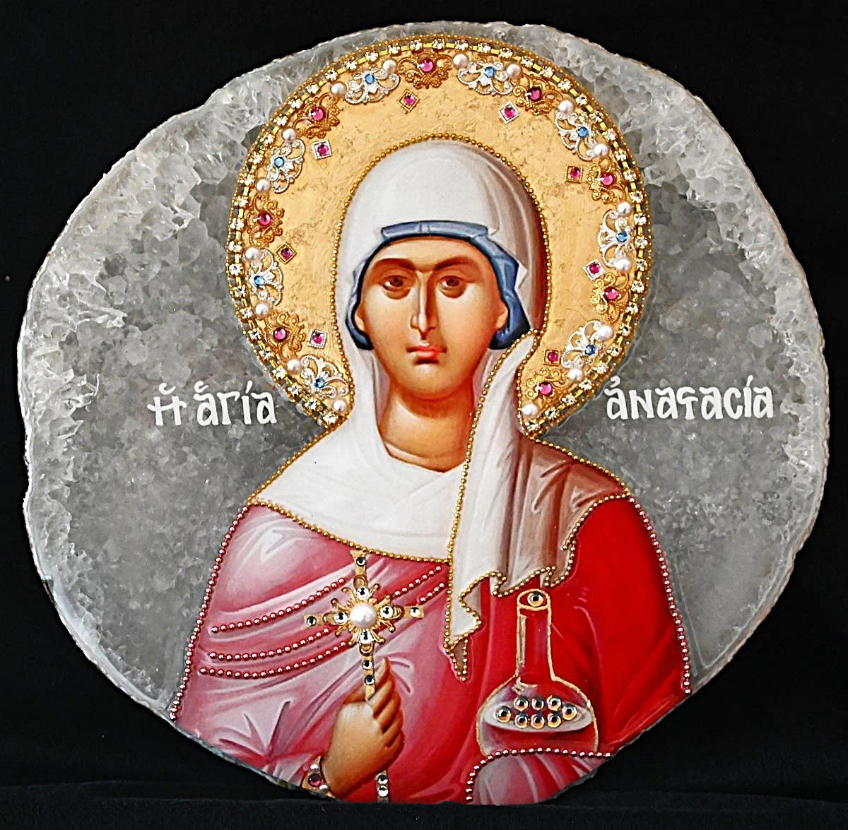 #AG31 SAINT ANASTASIA $220 DESCRIPTION: The icon is mounted on a piece of all white Brazilian quartz (7 ¼ “x 7 ½ “x ½ “) 3.8 lbs. The photostephano (halo) is encircled with gold and crystal metal strands and accented with gold and silver metal pieces, pearls and crystals. The garments are accented with gold and pink metal strands. The cross and the flask are accented with hand-gilded gold, pearls, metal pieces and crystals. The icon comes with a clear plastic stand. BACKGROUND: Click on the icon to read about the Saint.
