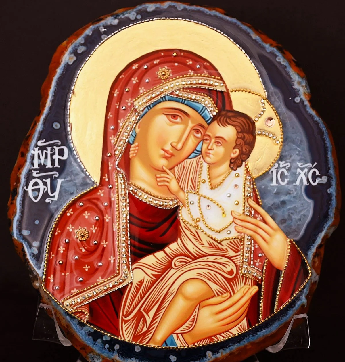 SOLD #AG6 PANAGIA WEALTH OF MANKIND $180 DESCRIPTION: The icon is mounted on a natural toffee brown with white quartz center Brazilian agate slice. (8 x 7 ¼ x ¼) 1.2 lbs. The photostephano (halo) is hand-gilded gold encircled with gold and red metal strands, metal pieces and pearls. The garments are enhanced with gold, silver, pearl and crystal metal strands with colored and metallic pearls. The icon comes with a clear plastic stand. BACKGROUND: Panagia is in the Kazan style of iconography from the 16th century.