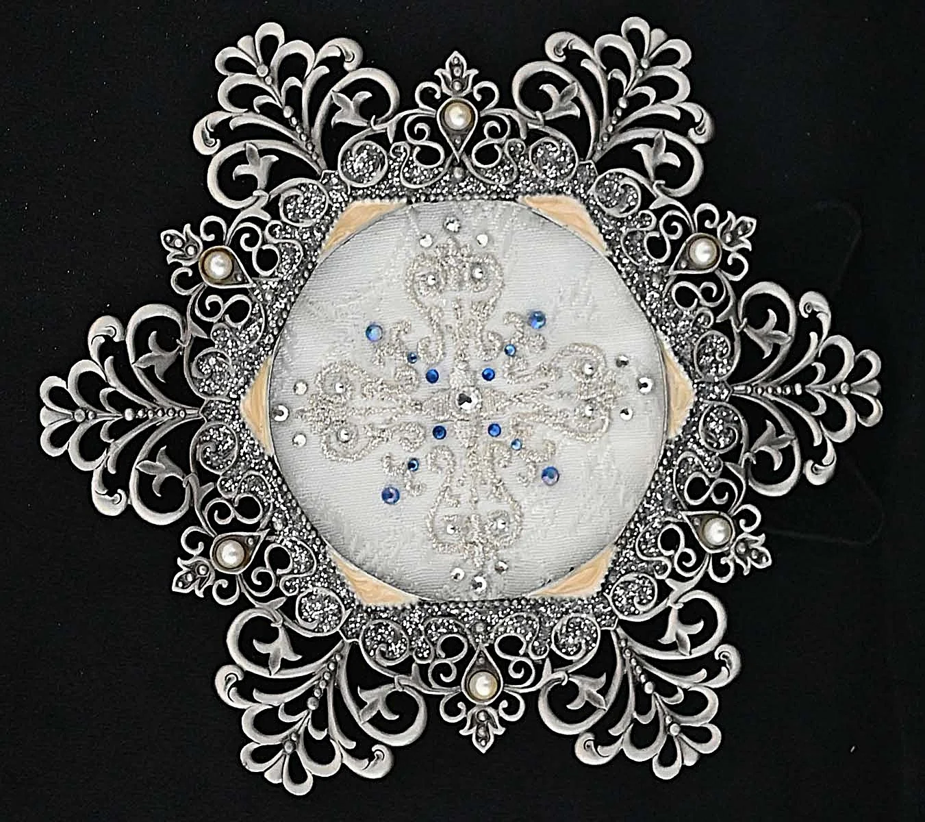 #EMB20 EMBROIDERED CROSS ON SNOWY WHITE $425 DESCRIPTION: Embroidered cross (19 ½”x 15 ½”) is matted to a silver frame (21 ¼” x 17”) on a white matte satin background. The cross and corners are embroidered with silver metallic thread and accented with crystals and silver balls.