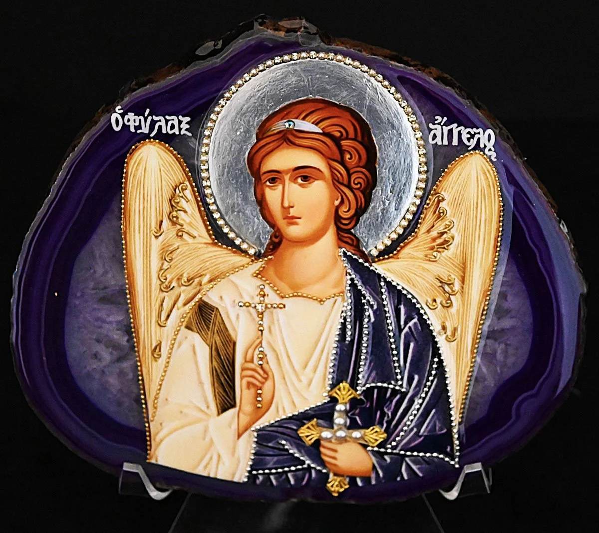 #AG26 GUARDIAN ANGEL $150 DESCRIPTION: The icon is mounted on a purple Brazlian agate with a quartz center (6 ¼ x 7 1/8 x ¼) 0.8 lbs. The photostephano (halo) is hand-gilded silver encircled with a pearl and crystal strand. The garments, wings cross and sword are accented with gold and silver metal strands, gold metal pieces and pearls. The icon comes with a clear plastic stand.