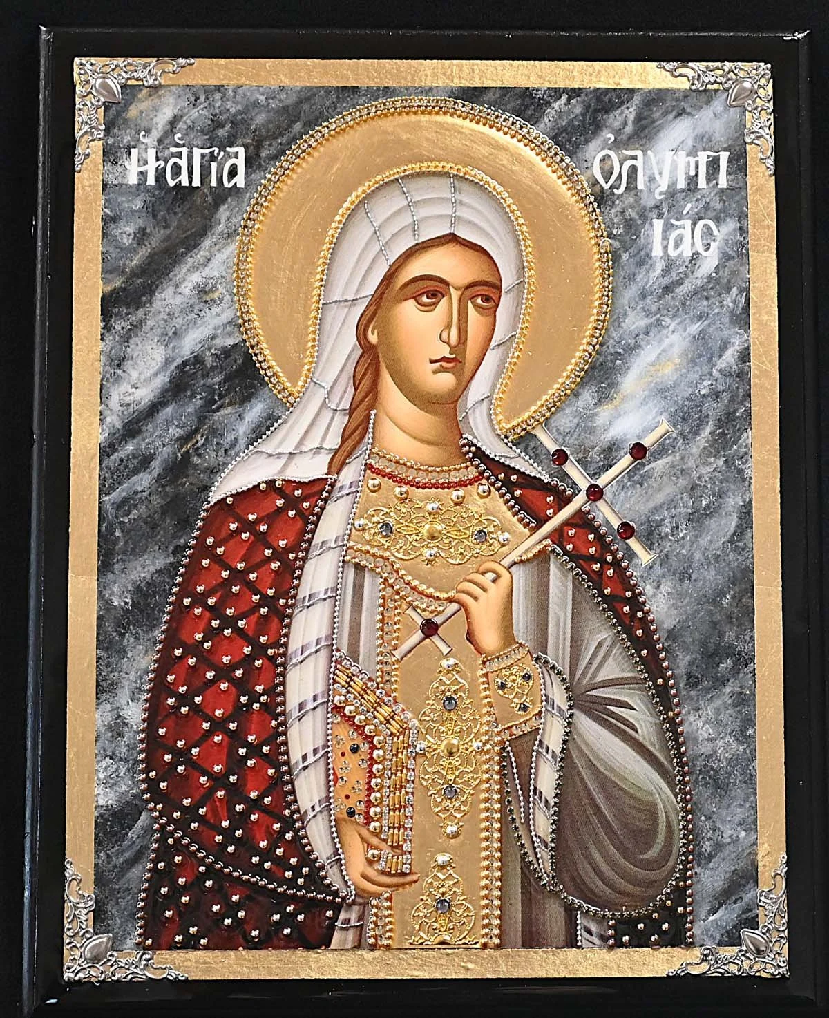 #WD17 SAINT OLYMPIAS $225 DESCRIPTION: The icon is mounted on a wood board (11”x14”). The background is black, marbled with white and gold. The photostephano (halo) and clothing have gold-gilding. The clothing is further accented with filigree pieces, multi-colored metal and crystal strands. The border is also gold-gilded and embellished with filigree pieces and crystals. BACKGROUND: Click on the icon to read about the Saint.