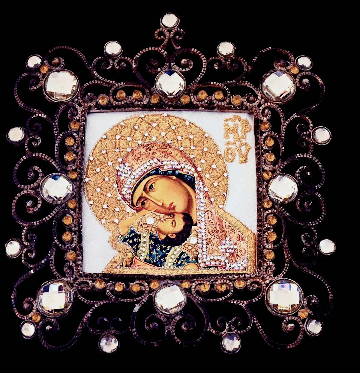 SOLD #WD18 PANAGIA ODIGITRIA $265 DESCRIPTION: This icon is mounted on a wood board (11” x 14”). The marbled background has hues of light rose and peach. Christ and Panagia’s photostephana (halos) are gold-gilded and adorned with filigree pieces, crystal and metal strands, pearls and crystals. The ivory-colored border is lined with a gold-gilded line and has gold filigree corners decorated with peach and white pearls and clear crystals.