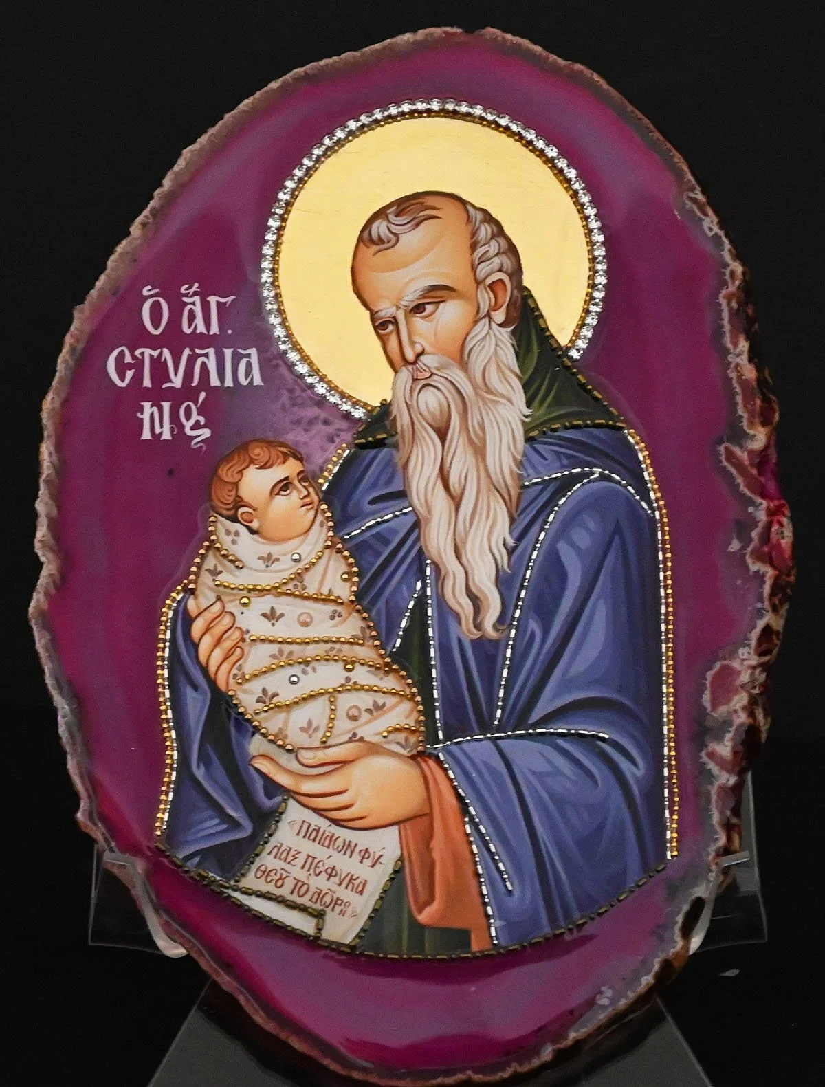 #AG18 SAINT STYLIANOS $105 DESCRIPTION: The icon is mounted on a pink Brazilian agate slice (7 5/8 x 5 3/8 x ¼) 0.6 lbs. The photostephano (halo) is hand-gilded gold with gold and silver clear crystal metal strands. The garments are accented with antique brass, silver and gold metal strands as well as white, gold and silver metallic pearls. The icon comes with a clear plastic stand. BACKGROUND: Click on the icon to read about the Saint.