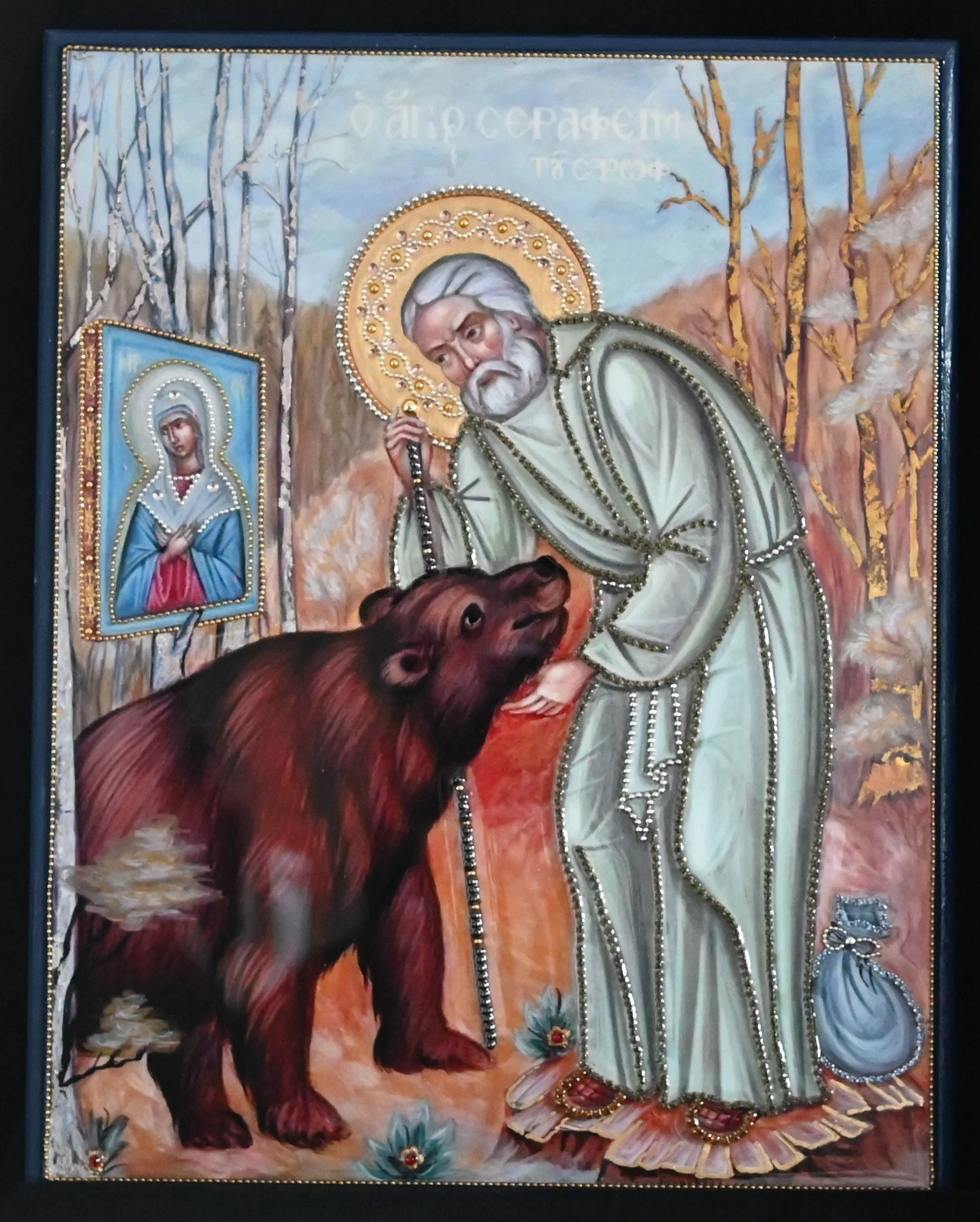 SOLD #WD22 SAINT SERAPHIM OF SAROV $230 DESCRIPTION: The icon is mounted on (11” x 14”) wood. The bevel of is a dark blue color. The icon is embellished with gold, silver and multi- colored gilding and further accented with gold, silver and colored metal strands, filigree pieces and crystals. The clothing and the photostephano (halo) are adorned with metal and crystal strands. BACKGROUND: Click the icon to read about the Saint.