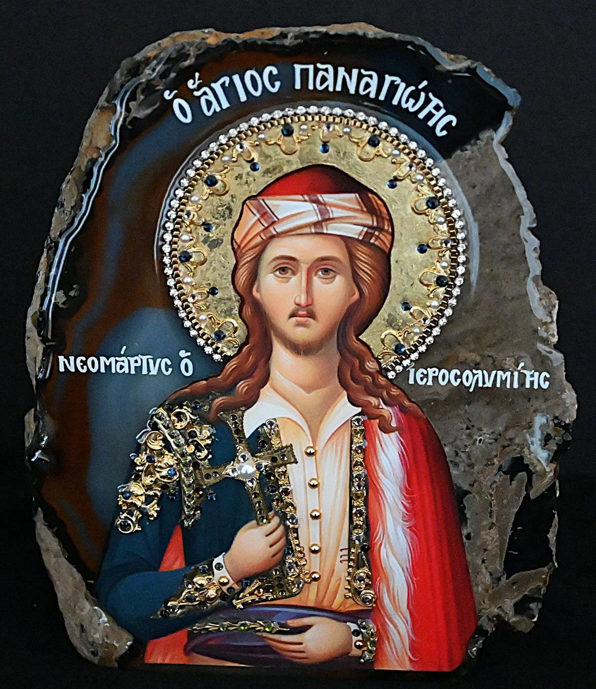 #AG30 SAINT PANAYIOTI $225 DESCRIPTION: The icon is mounted on a free standing, Brazilian agate end with black and earth tone terracotta blends (7 ¼” x 3 ½ ) 7.4 lbs. The Saint’s garments are embellished with metal strands, metal pieces, pearls and crystals. His photostephano (halo) is accented with hand-gilded gold, pearls, metal strands, metal pieces and crystals. BACKGROUND: Click on the icon to read about the Saint.